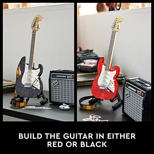 - The guitar features a posable whammy bar, pickup switch and tuning pegs, six strings, Fender logo stickers, and a textile strap. The bricks included let you build the guitar in red or black