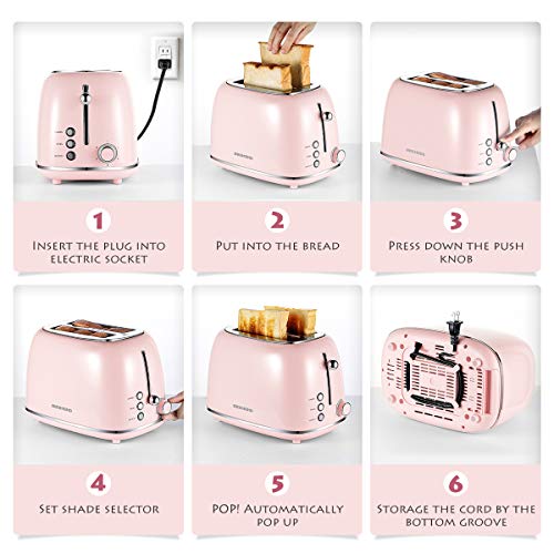 REDMOND Tostadora de 2 rebanadas de acero inoxidable retro con bagel, cancelación, función de descongelación y 6 ajustes de sombra de pan, ranura extra ancha y bandeja extraíble para migas, rosa, ST028